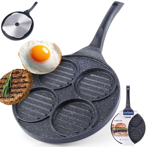 Patelnia do grillowania burgerów i jajek Orion 113201 (4 otwory) to praktyczna patelnia granitowa przeznaczona do jednoczesnego smażenia czterech kotletów lub jajek — idealna dla osób przygotowujących szybkie posiłki o stałej formie i równomiernym wysmażeniu.