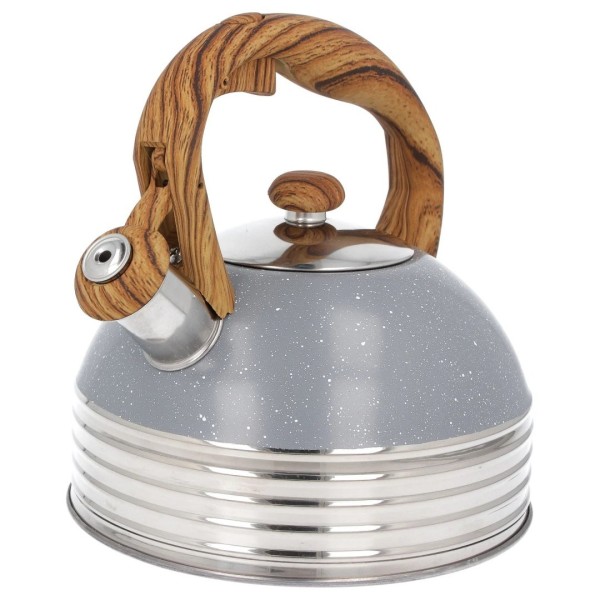 Чайник, Brunbeste, Czajnik stalowy z gwizdkiem na indukcję 2.5L szary marmurek uchwyt drewno, BB-2477, для індукції, серый мрамор/дерево призначений для щоденного використання на всіх типах плит, включно з індукційними. Це стильний і функціональний кухонний аксесуар об'ємом 2.5 л, що поєднує міцну конструкцію зі зручністю експлуатації; ідеальний для приготування чаю або кип'ятіння води для приготування напоїв і страв.