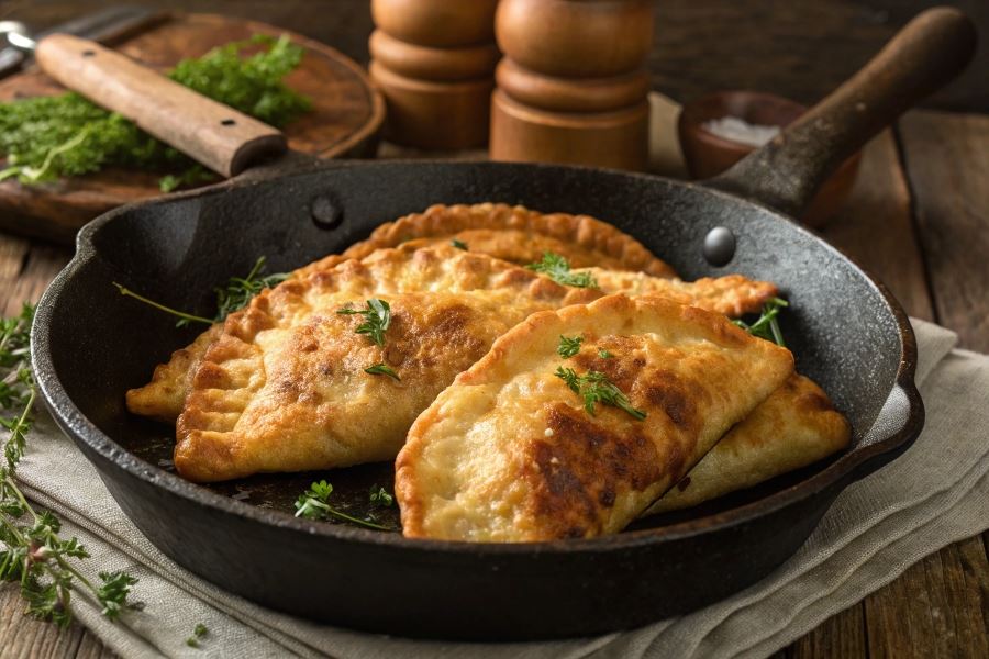 Wskazówka eksperta: Aby czebureki nie rozkleiły się podczas smażenia, użyj widelca do mocnego dociśnięcia brzegów. Możesz też zawinąć brzeg do góry i zapleść go, tworząc ozdobny warkocz, co dodatkowo zabezpieczy nadzienie.