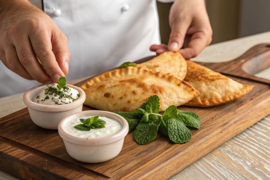 Sos jogurtowy najlepiej komponuje się z czeburekiami o nadzienia jagnięcym lub wołowym, gdzie świeżość mięty i ostrość czosnku przełamują intensywność mięsa.
