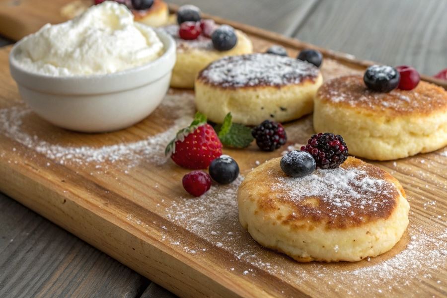 - Smaż syrniki po 4-5 minut z każdej strony do uzyskania złocistej skórki.