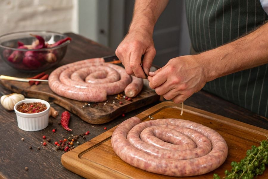 Po dokładnym wymieszaniu masy mięsnej z przyprawami (proces trwający 8-12 minut), następuje nadziewanie jelit. Jelita naturalne należy moczyć w letniej wodzie przez minimum 30 minut przed użyciem, co nadaje im elastyczność i zapobiega pękaniu.