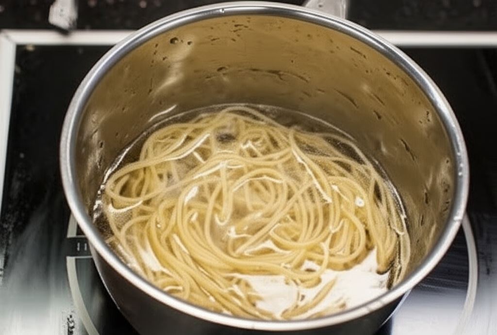Do gotującej się wody z solą wsyp porcję spaghetti lub makaronu jajecznego i gotuj według instrukcji producenta podanych na opakowaniu. Kiedy osiągnie stan al dente, odcedź i odstaw na bok.