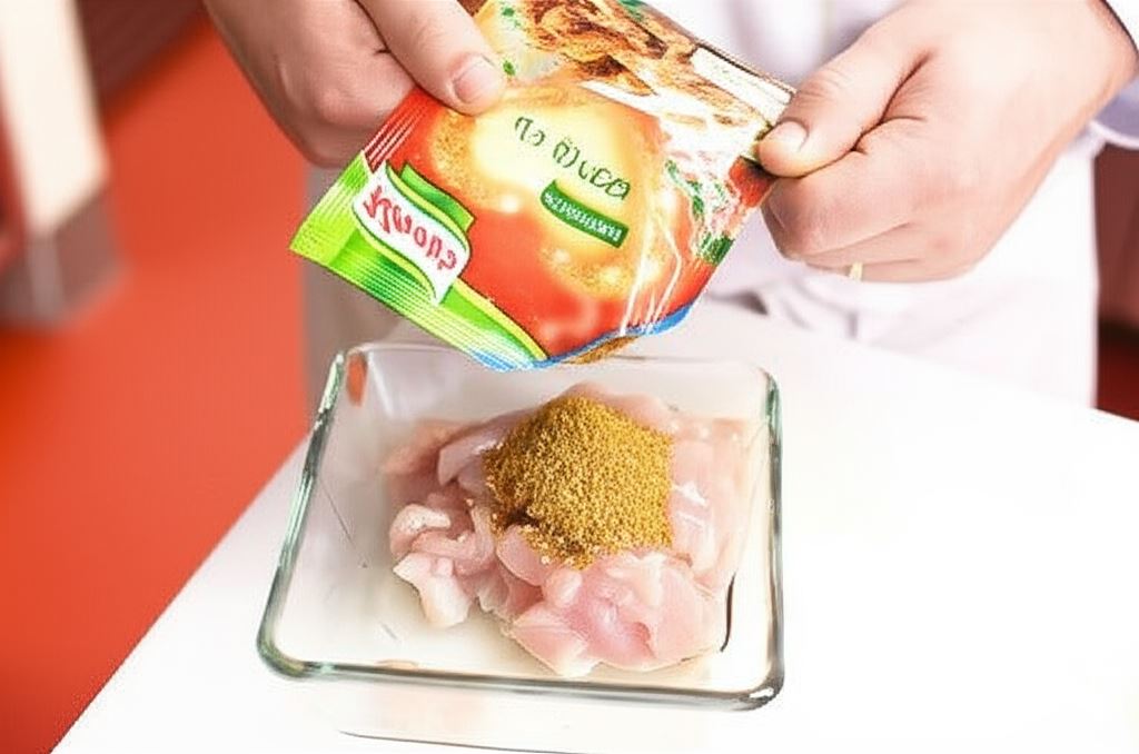 Mięso kurczaka potnij w cienkie paski, skrop jedną łyżką oleju i dopraw przyprawą Knorr. Odłóż na 10 minut.
