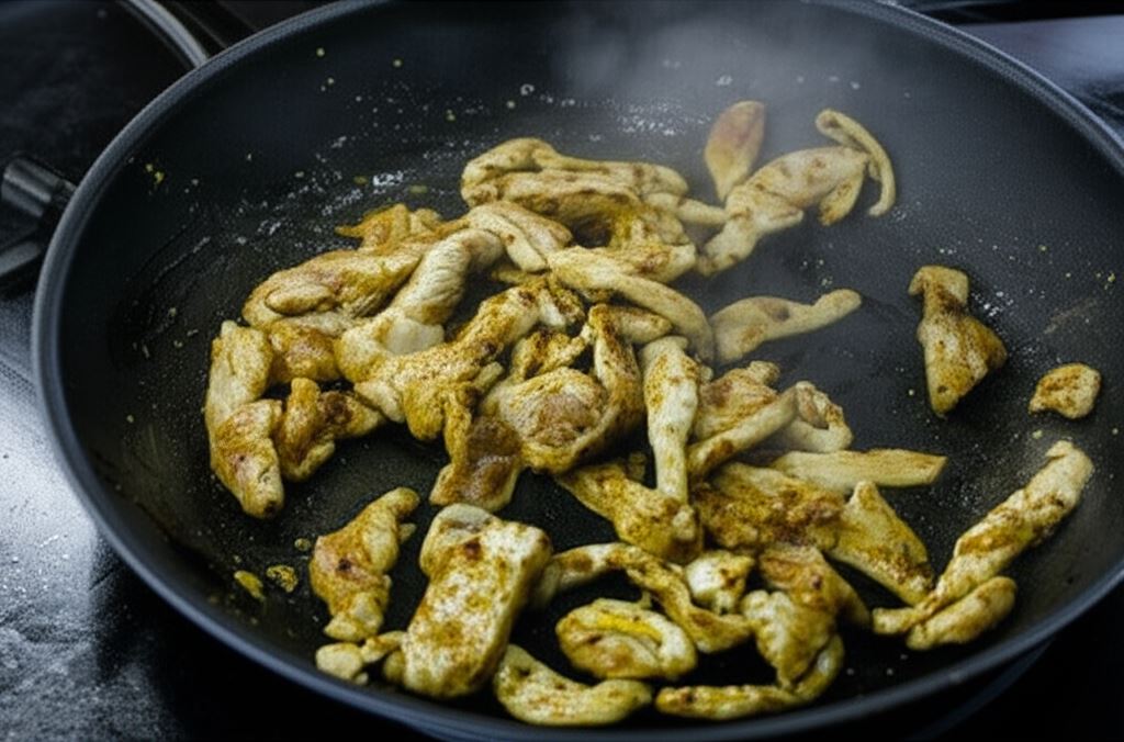 Potem na patelni podgrzej resztę oleju i przyrumień mięso, aż uzyska złocisty kolor.