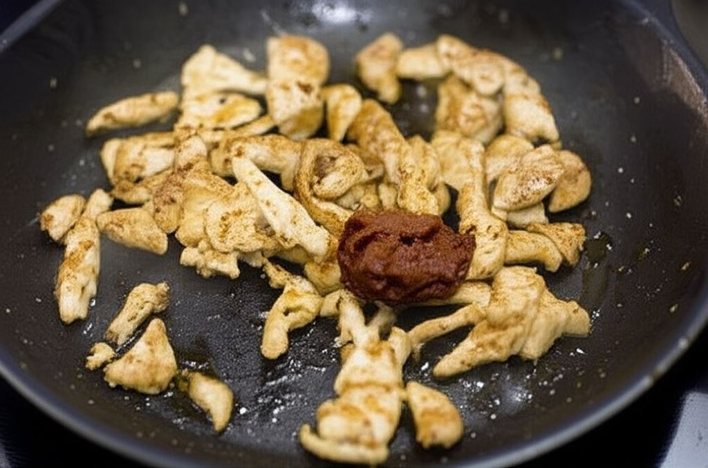 Wmieszaj koncentrat pomidorowy i smaż do momentu, gdy składniki się połączą. Odłóż mięso do lekkiego przestudzenia i dodaj posiekaną kolendrę.