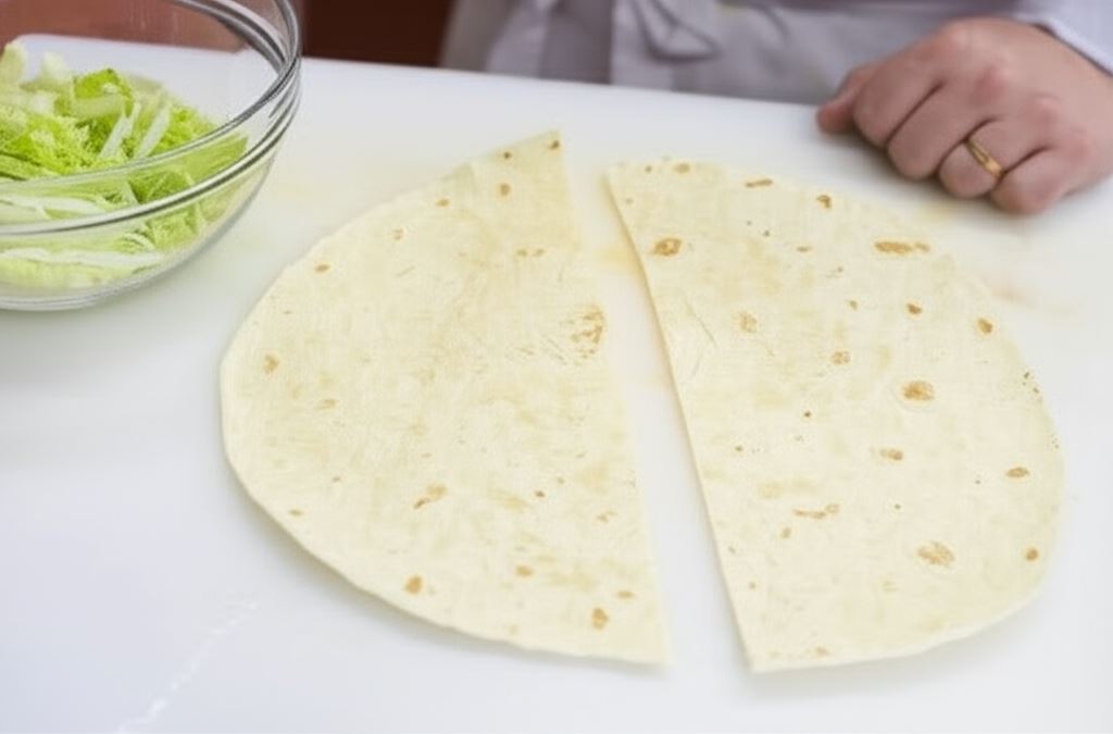 Sałatę lodową potnij nożem na cienkie paski. Okrągłe placki tortilli przetnij na połowę.