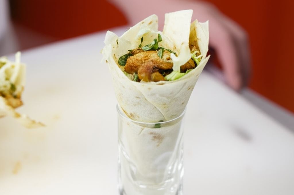 Na tortilli umieść mięso z sosem, potem dodaj sałatę i zwiń w rożek. Każdy umieszczaj w małym kubeczku albo filiżance.