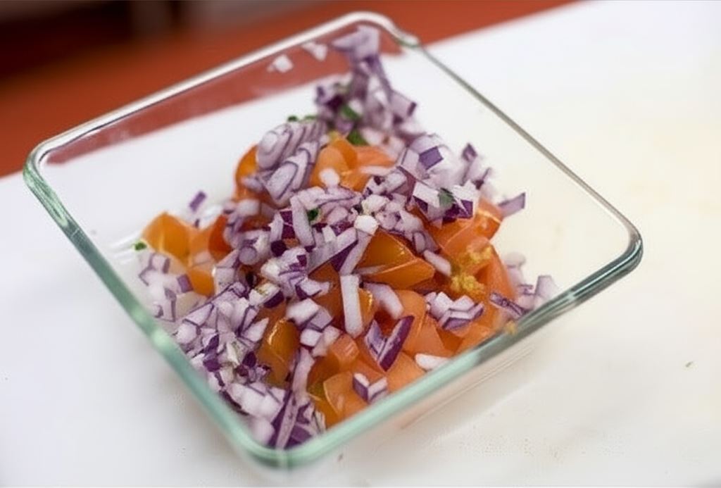 Sporządź salsę. Pomidory posiekaj w małą kostkę razem z pestkami i umieść w miseczce. Tak samo cebulę.