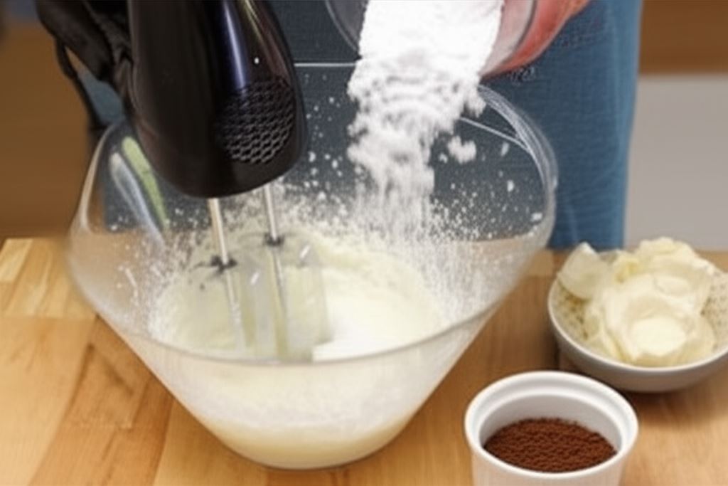 Ubij mikserem śmietankę z cukrem pudrem, potem stopniowo dodawaj serek mascarpone i kawę rozpuszczalną. Dokładnie wymieszaj.