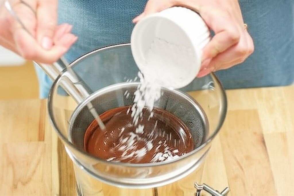 Rozpuść 80 g czekolady w kąpieli wodnej i mieszaj aż się rozpuści, odstaw i wsyp cukier puder. Wymieszaj energicznie.