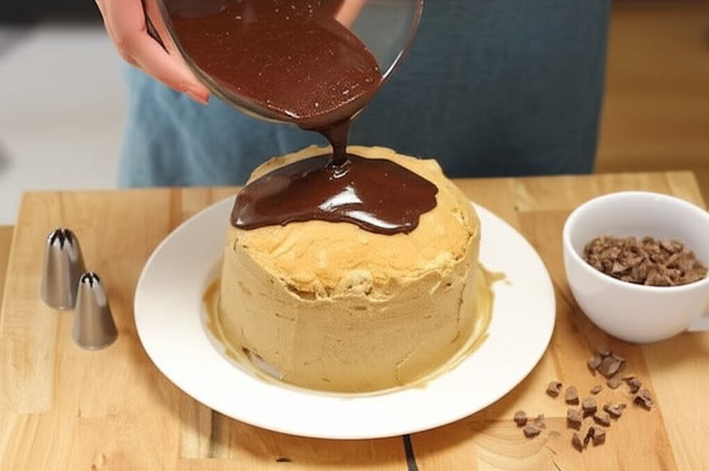 Oblej ciasto wykonaną polewą i obsyp wiórkami pozostałej, utartej czekolady.