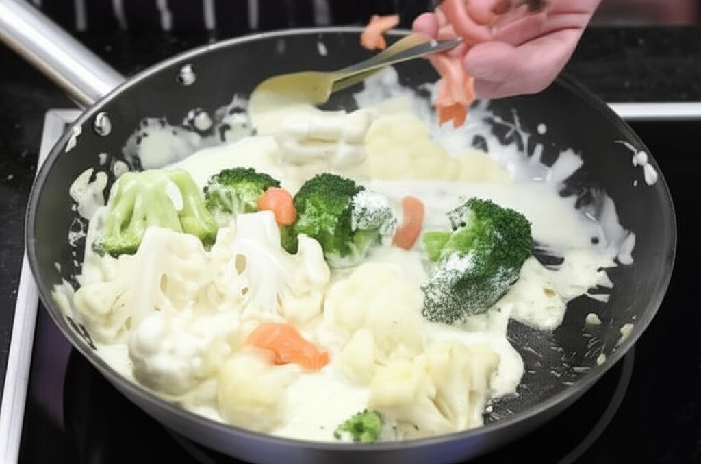 Fix Makaron kremowe 4 sery z mozzarellą Knorr połącz ze śmietanką i dodaj do warzyw.