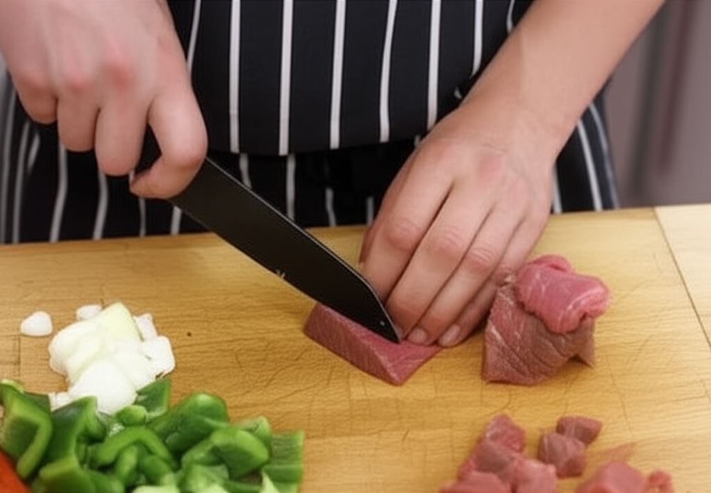 Mięso potnij na grube kawałki. Tak samo pokrój cebulę, paprykę i ziemniaki.