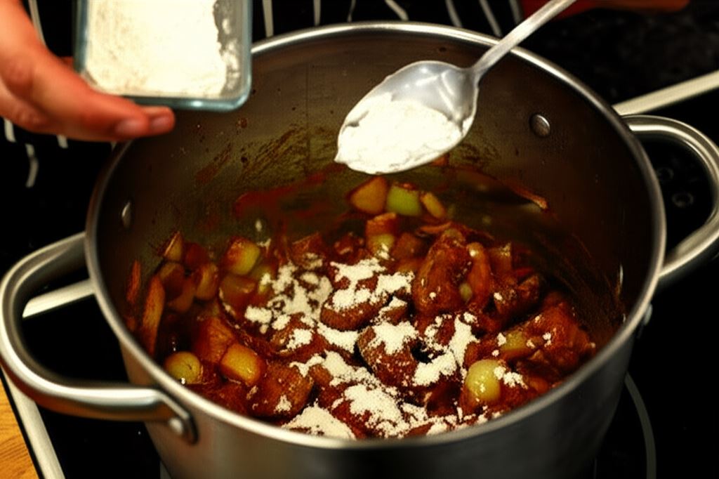 Podsmaż cebulę z papryką słodką. Potem dodaj mięso, pomidorowy koncentrat i smaż krótko na silnym ogniu. Posyp mąką.