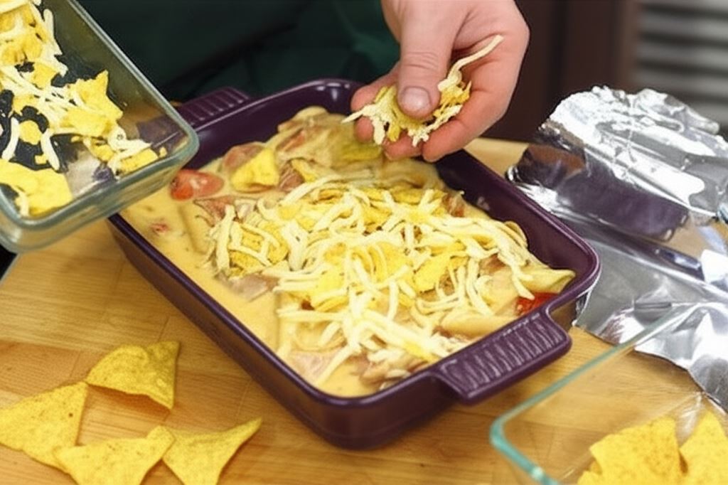 Na wierzchu rozsyp resztę sera wymieszanego z pokruszonymi chipsami nachos. Wszystko owiń folią aluminiową i umieść w rozgrzanym do 200°C piekarniku na 30 minut. Po upływie tego czasu zdejmij folię z zapiekanki i piecz dodatkowo 5 minut, aby ser na wierzchu lekko się zrumienił.