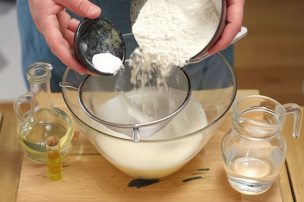 Kiedy cukier się rozpuści zdejmij z kąpieli wodnej, dodaj olej, wodę, ekstrakt i przesianą mąkę z proszkiem do pieczenia.