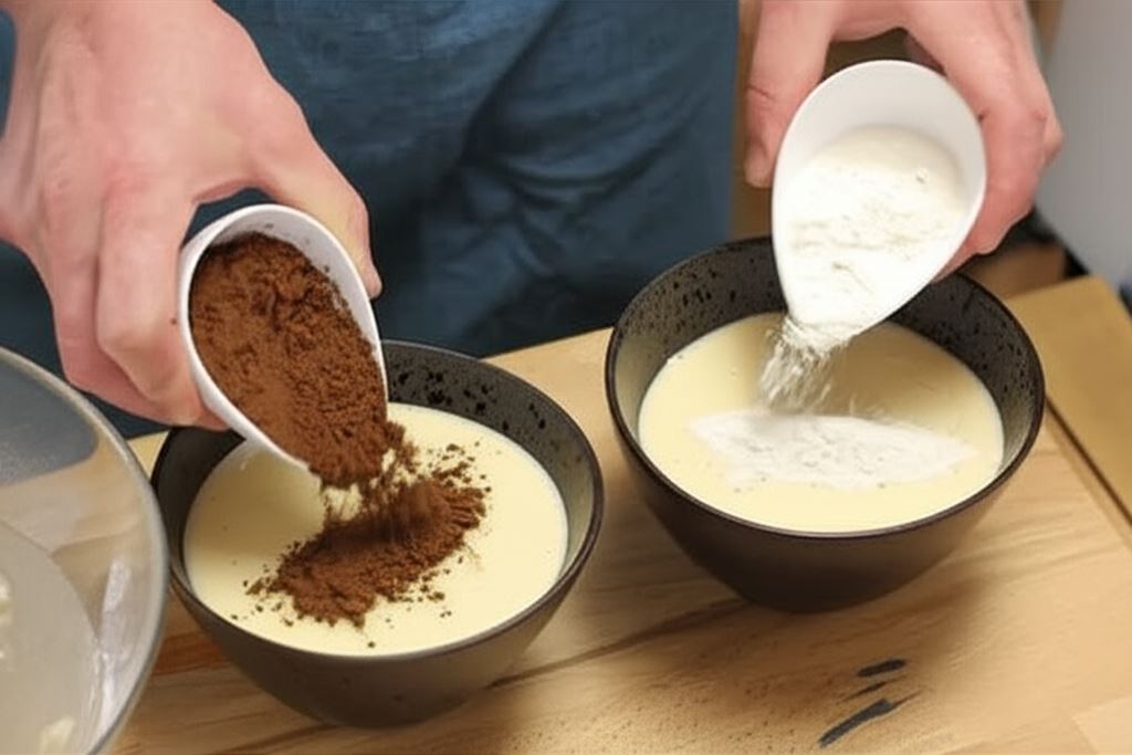 Przygotowane ciasto rozdziel na dwie porcje. Do pierwszej wsyp kakao, a do drugiej 3 łyżki mąki. Każdą część zamieszaj.