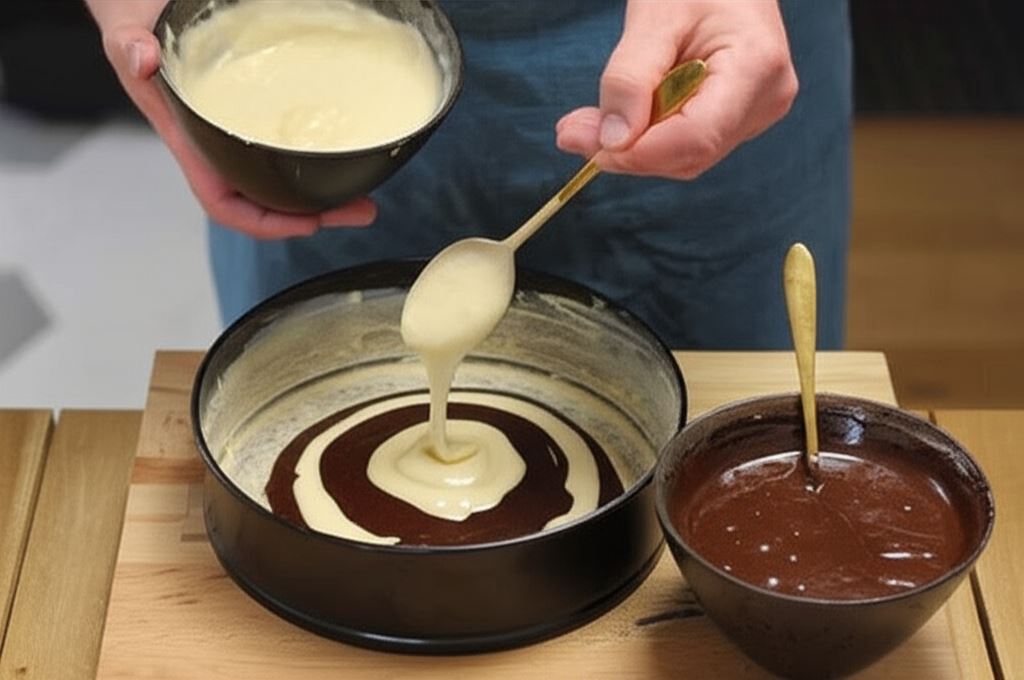 Na środek uprzednio przygotowanej tortownicy wlewaj naprzemiennie 2 łyżki ciemnego ciasta i 2 łyżki jasnego.