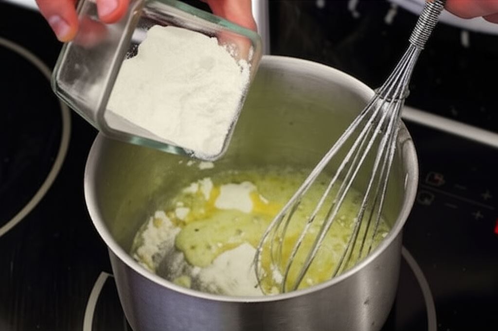 W głębokiej patelni roztop masło, posyp mąką i zrumień na złoty odcień.