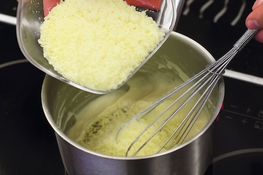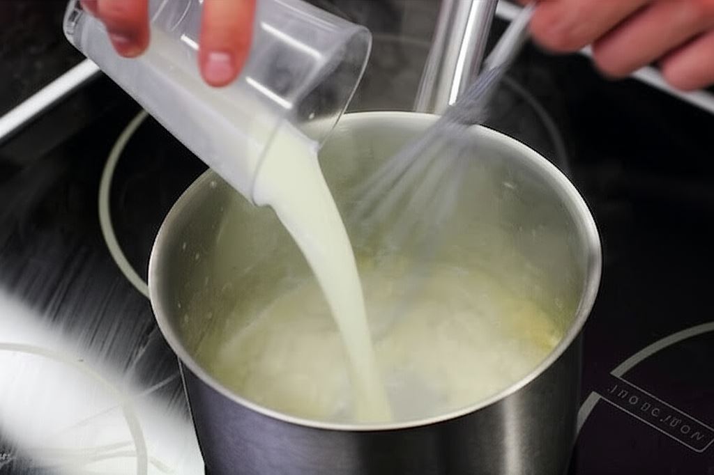 Dodaj mleko, zamieszaj, gotując dalej, dopóki sos nie stanie się gęsty.