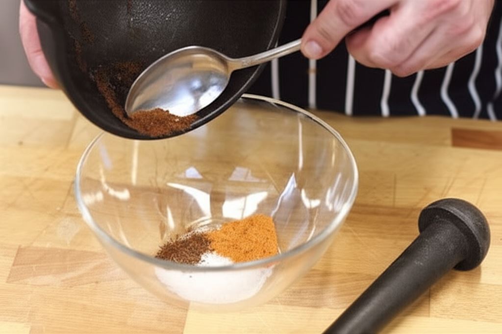 Pokrusz goździki i cynamon, po czym połącz z przyprawą do mięs i łyżeczką cukru.