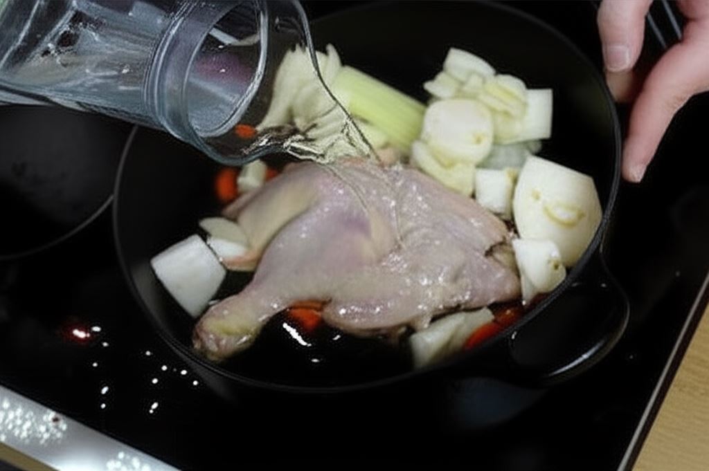 Włoszczyznę oczyść i obierz, wrzuć do garnka wraz z korpusami kurczaka, zalej 1,5 litra wody i gotuj około 30 minut. Następnie dodaj do wywaru ziele angielskie, liść laurowy oraz ziarna pieprzu. Całość gotuj przez kolejne 20 minut. Po tym czasie odcedź wywar. Powinno być go maksymalnie 800 ml.