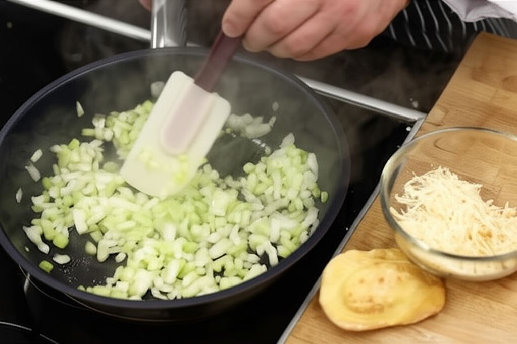 Korzenie selera naciowego i cebulę posiekaj w małą kosteczkę i zrumień na patelni na gorącym oleju, odłóż na bok. Oscypki zetrzyj na tarce do osobnego naczynia.