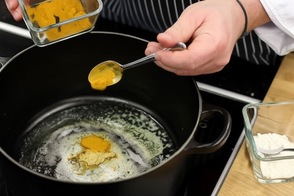 Roztop masło na spodzie garnka, wsyp imbir w proszku oraz kurkumę, tymianek i majeranek. Podsmaż moment, po czym wsyp mąkę i całość starannie wymieszaj.