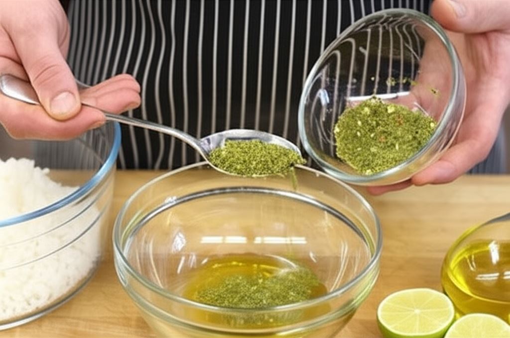 Ryż ugotuj zgodnie z instrukcją na opakowaniu i ostudź. Przygotuj sos – zawartość opakowania Knorr wymieszaj z sokiem z limonki i oliwą.