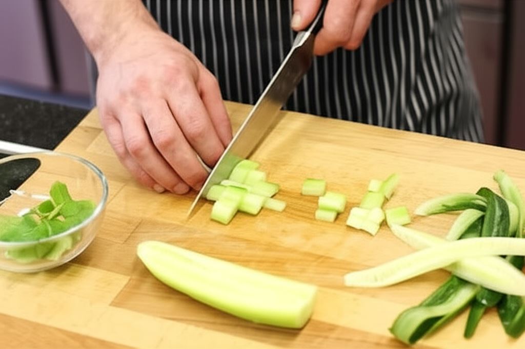 Obierz ogórka ze skórki, przekrój wzdłuż na cztery części i usuń nasiona. Pokrój w kawałki o grubości jednego centymetra. Miętę posiekaj drobno.