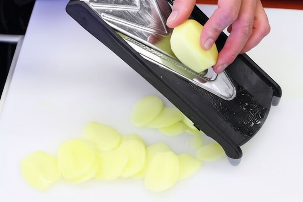 Ziemniaki obierz, umyj i osusz. Za pomocą łopatki do krojenia sera albo noża pokrój ziemniaki na cienkie plasterki.