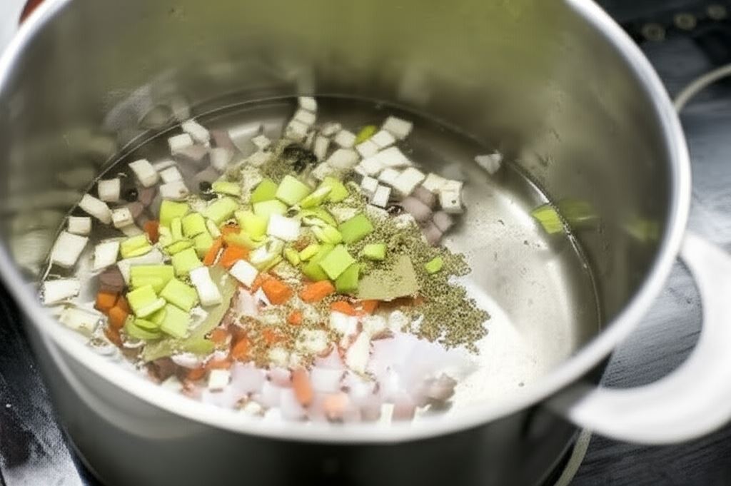 Boczek przepłucz, potnij w kostkę i zalej dwoma litrami wody. Wsyp drobno posiekane warzywa, majeranek, liść laurowy i ziele angielskie. Przygotuj wywar.