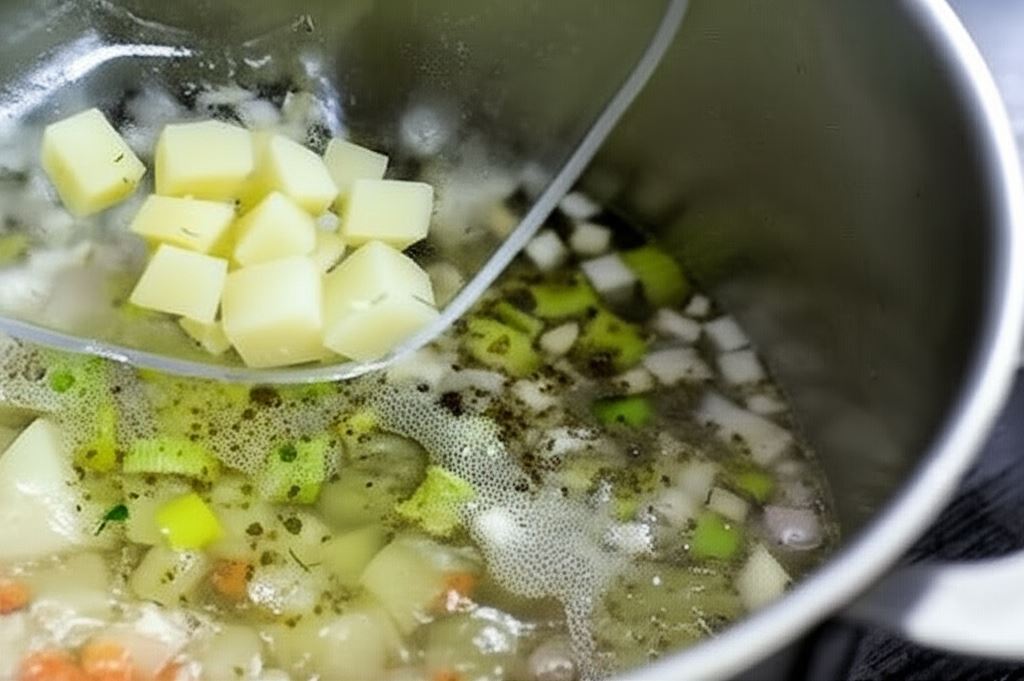 Ziemniaki pokrój w kosteczkę i wrzuć do zupy. Gotuj do miękkości.