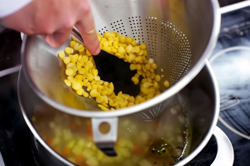 Przetarty groch przepuść przez sitko i wlej do bulionu.