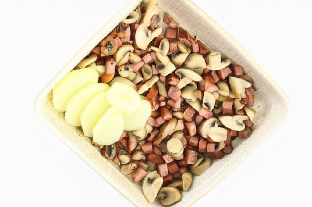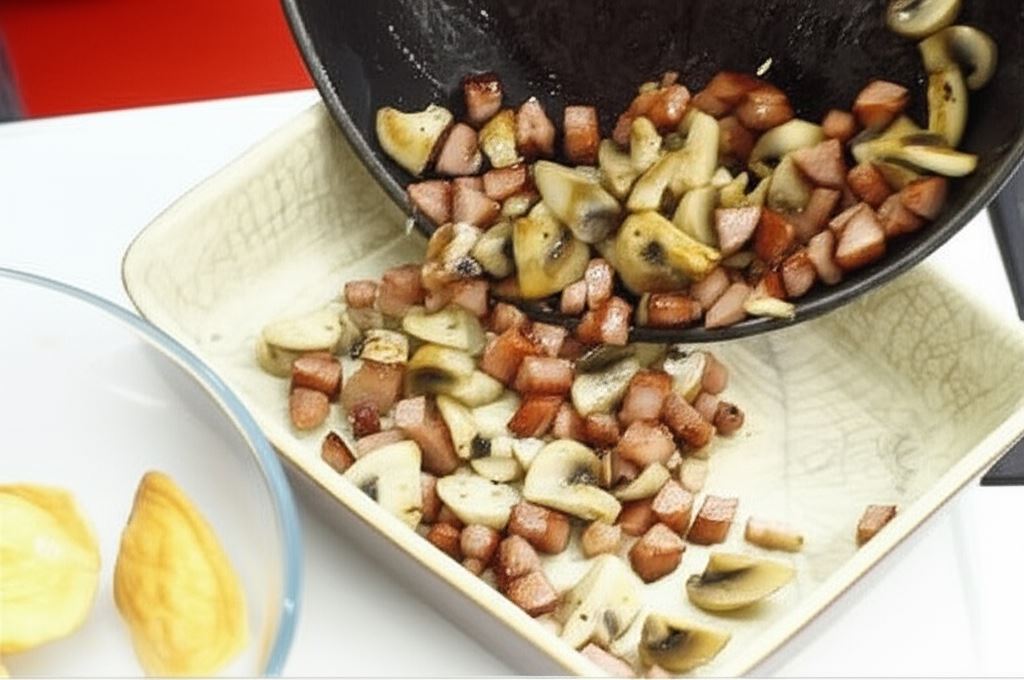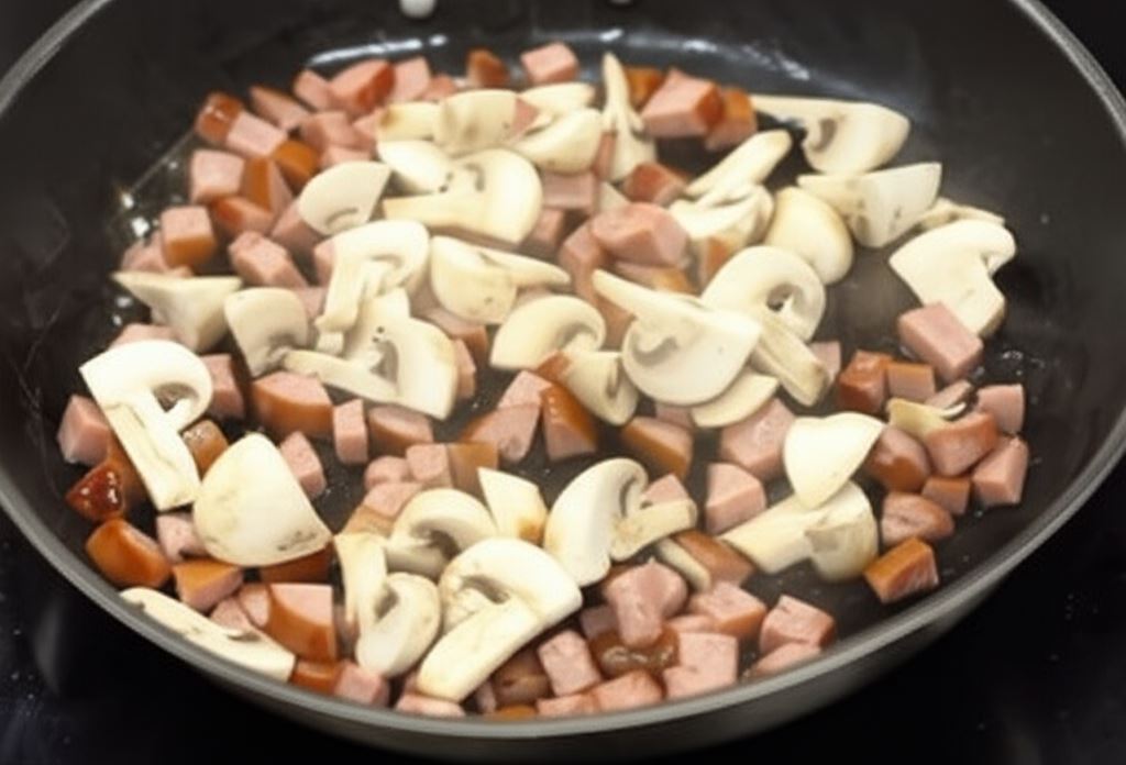 Kiełbasę potnij w kostkę, a pieczarki w kawałki. Smaż na patelni do momentu, aż wszystko będzie zrumienione.