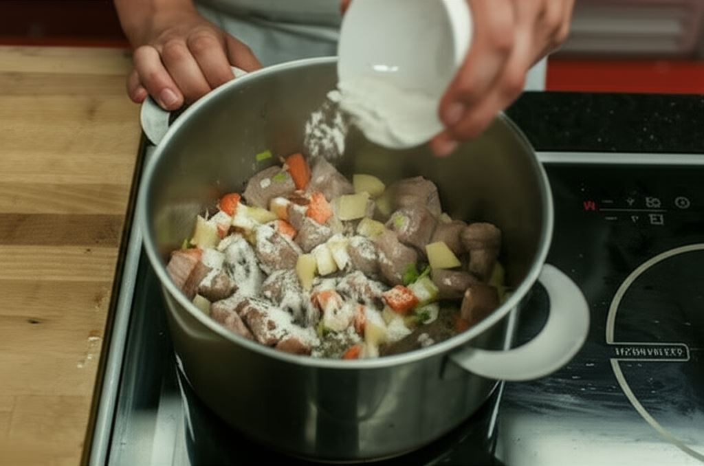 Mięso potnij w kostkę i przyrumień w garnku. Kiedy się zrumieni, wsyp pokrojoną w kostkę włoszczyznę, ziemniaki oraz paprykę i posyp łyżką mąki.