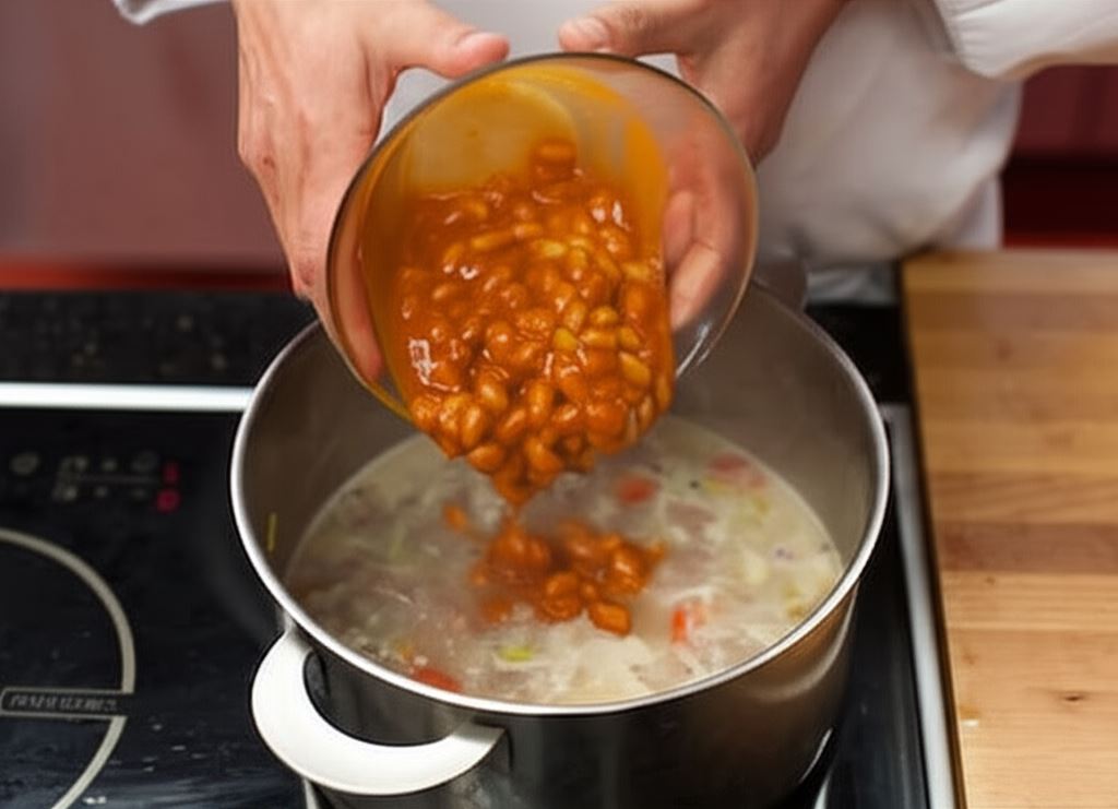 Zalej wszystko 1 l wody i gotuj do momentu, aż mięso stanie się całkowicie miękkie. Pod koniec gotowania wsyp fasolę z sosem pomidorowym.