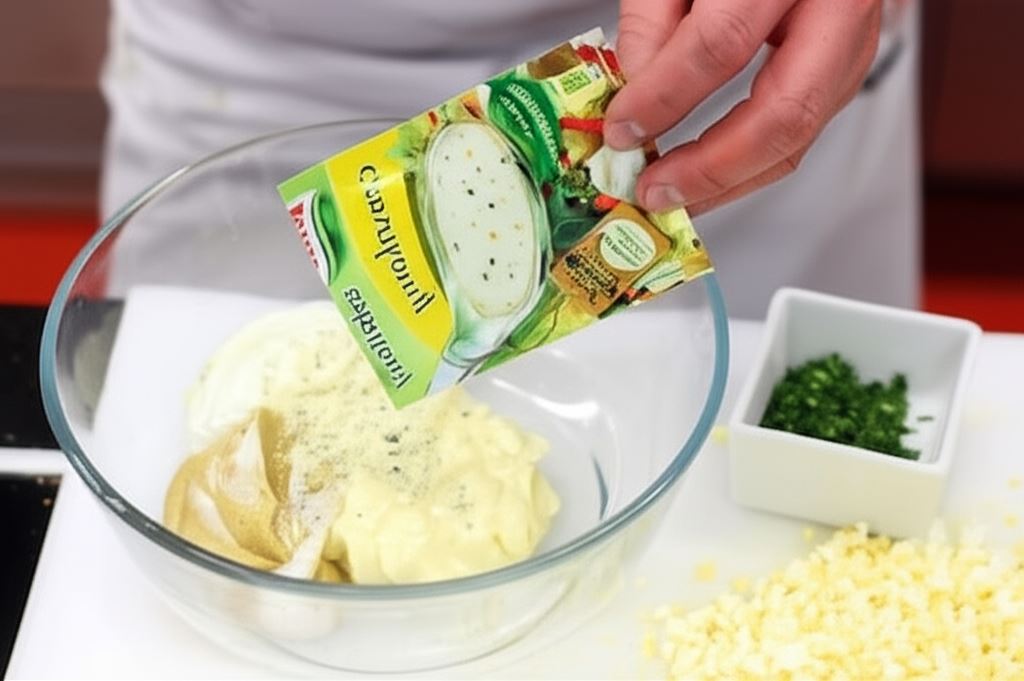 Sos sałatkowy Knorr połącz starannie z majonezem, musztardą i śmietaną.