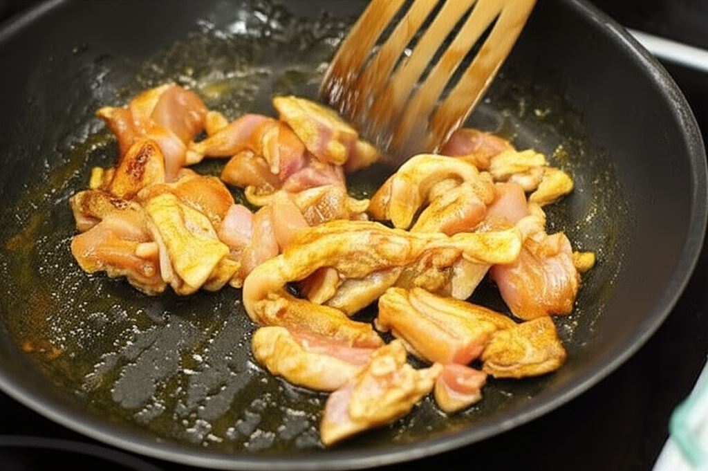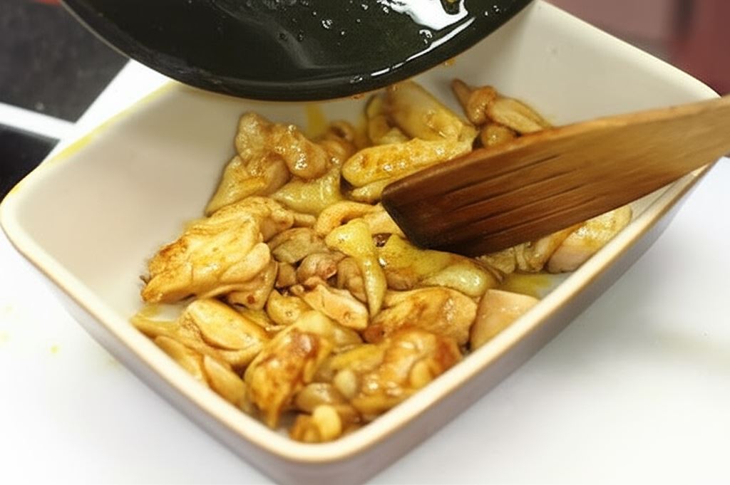 Na spód naczynia żaroodpornego połóż podsmażonego kurczaka.