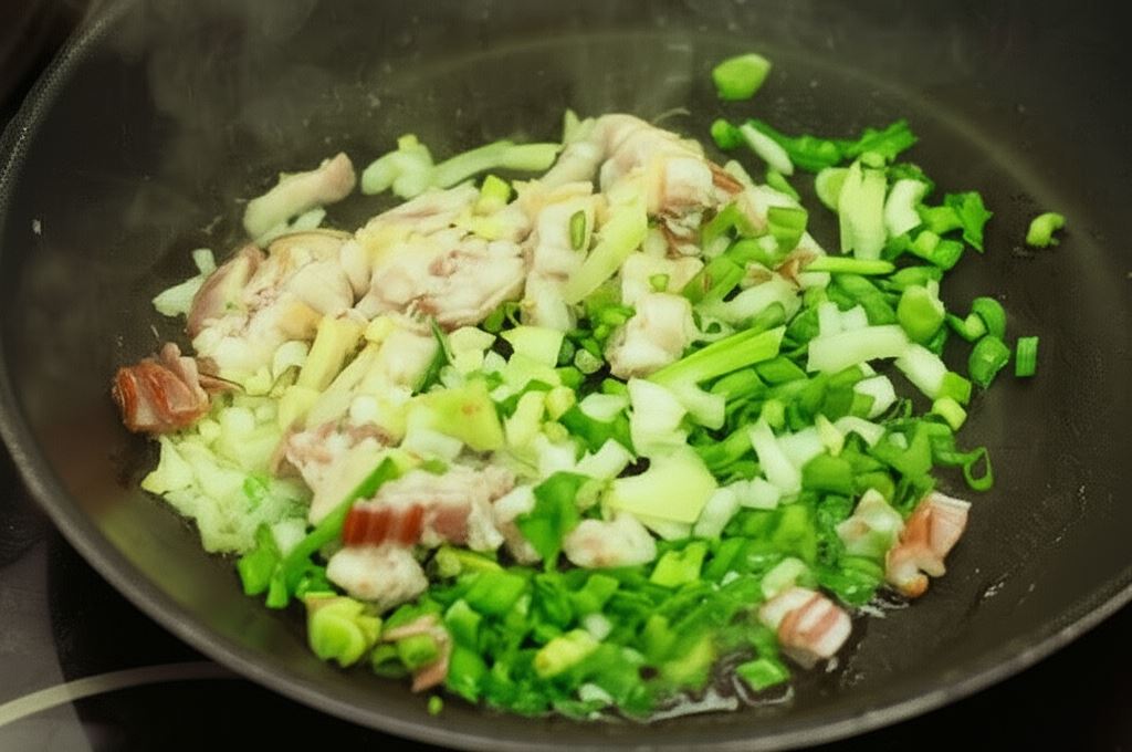 Cebulkę dymkę ze szczypiorem i boczek posiekaj drobno. Przysmaż na osobnej patelni.