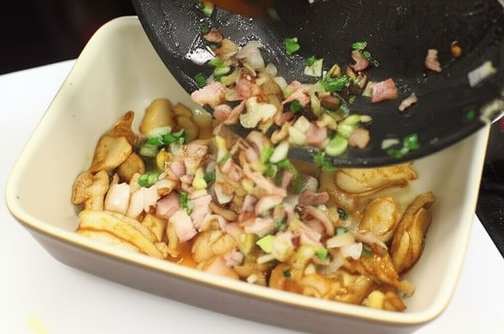 Potem przenieś cebulę wraz ze szczypiorem i boczkiem.