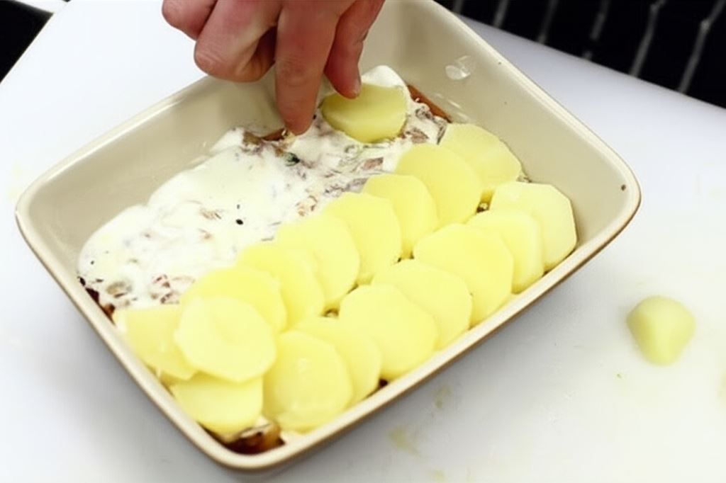 Aromatyczna zapiekanka ziemniaczana z kurczakiem to prawdziwa uczta dla podniebienia! Soczyste kawałki kurczaka, chrupiący boczek i kremowa śmietana tworzą harmonijne połączenie, które zachwyci każdego miłośnika domowych, sycących dań. Plastry ziemniaków przykrywające całość nabierają złocistego koloru i wspaniale komponują się z pozostałymi składnikami.