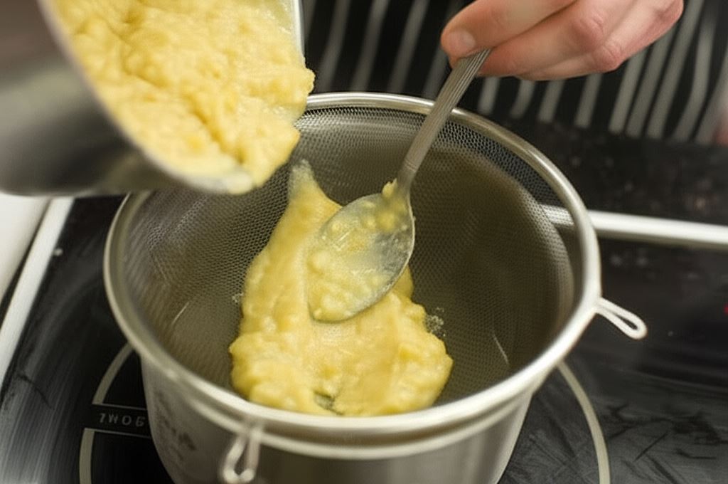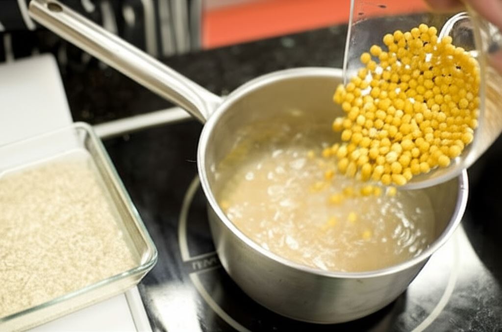 Przeciśnij groch i połącz z wywarem kostnym, potem wsyp pęczak.