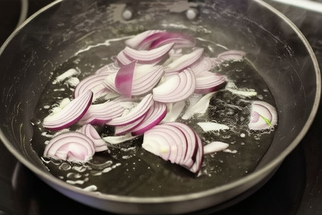 Cebulę posiekaj w piórka i delikatnie zrumień na oleju.