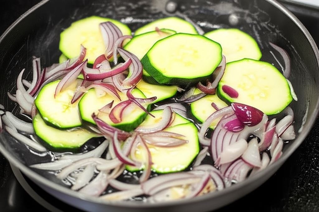 Gdy cebula zrumieni się, wsyp cukinię pokrojoną w plastry i smaż przez kilka minut więcej.