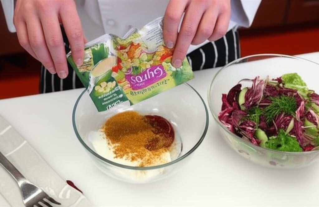 Sos sałatkowy Knorr połącz z jogurtem, ketchupem i odrobiną cynamonu. Skrop warzywa sosem na wierzchu i obsyp grzankami.