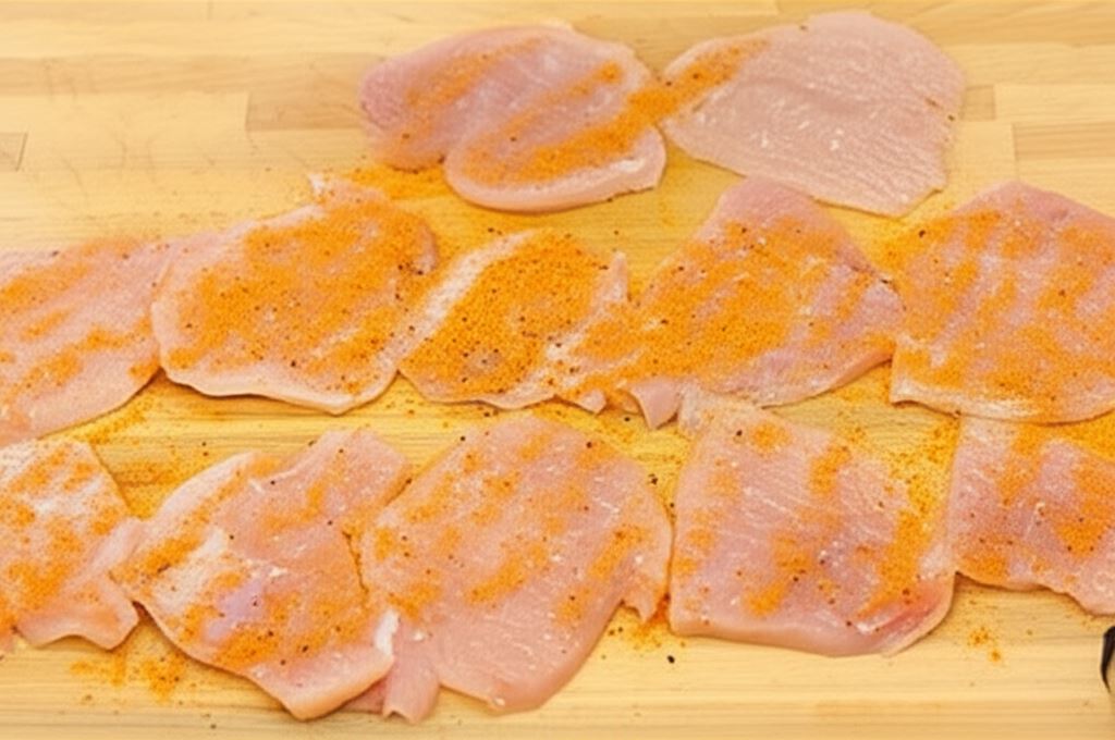 Filety kurczaka potnij ukośnie na cienkie plastry. Jeżeli okażą się zbyt grube, lekko roztłucz je tłuczkiem. Posyp kurczaka przyprawą do mięsa.
