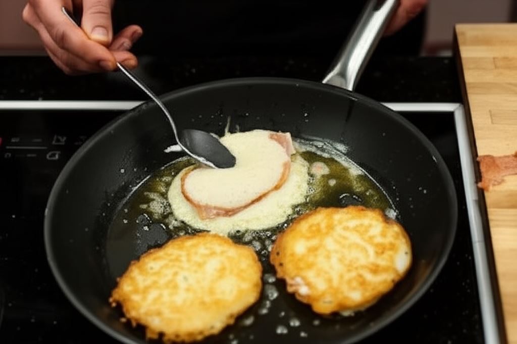 Na patelnię z gorącym tłuszczem wlej cienką warstwę ciasta, a na nią połóż plaster mięsa, który nakryj następną łyżką ciasta. Smaż około 5 minut z każdej strony. Przed serwowaniem upewnij się, czy kurczak jest odpowiednio usmażony, jeśli nie, trzymaj go na patelni jeszcze moment.
