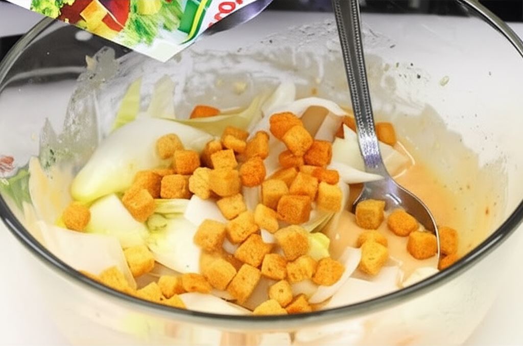 Sporządź sos sałatkowy. Połącz zawartość opakowania Knorr z majonezem, ketchupem, oraz sokiem pomarańczowym. Od cykorii odetnij końcówki, rozdziel wszystkie liście, umyj je i osusz. Zostaw kilka całych liści cykorii do dekoracji. Pozostałe pokrój ukośnie w dwucentymetrowe kawałki i włóż do miski z dresingiem. Dodaj do nich grzanki.